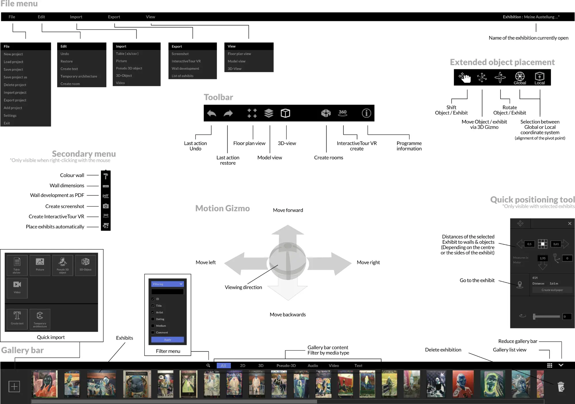 You will find the “Gallery bar” in the lower application area. In this area, the imported exhibits are displayed and selected for placement. Various filter and search options help you to find the desired exhibit in the shortest possible time, even for extensive exhibition projects.