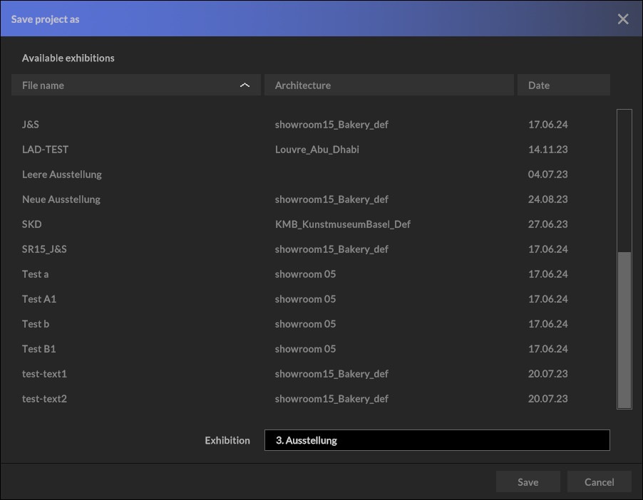 3) Save your exhibition by clicking on “File / Save project”. Proceed in the same way with the remaining rooms and exhibits.